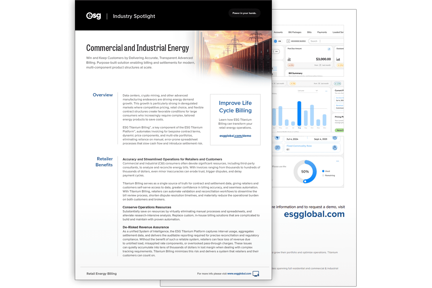 Advanced Billing: Titanium Billing delivers built-in support for complex billing needs, including block and index, load following, hedges, locks, swing, on-peak/off-peak, hourly, banding, and time-of-use structures. ESG recognizes that C&I customers require flexible energy products and tailored pricing models. Titanium Billing enables retailers to configure and implement customized billing solutions using proven building blocks, helping to optimize costs and streamline deployment.