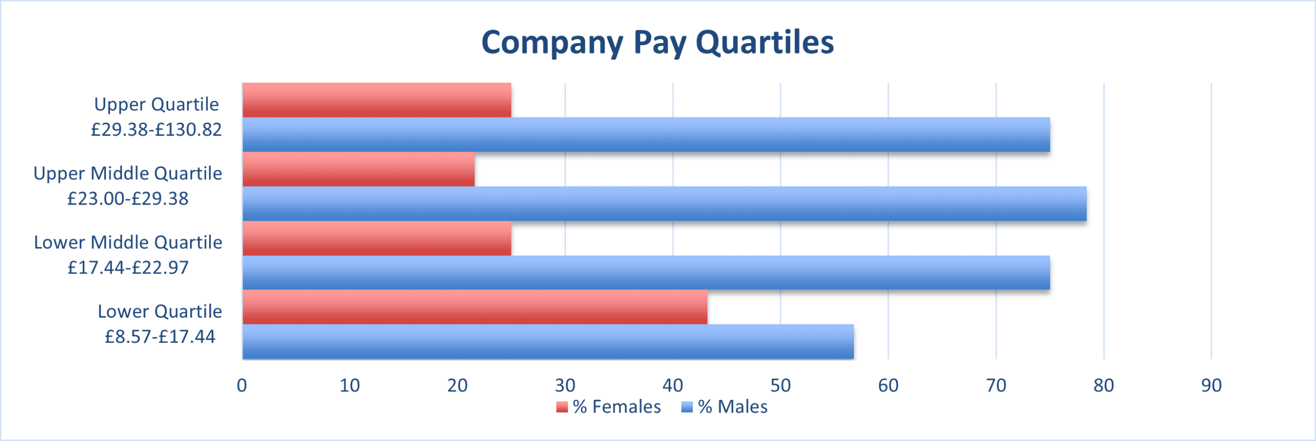 The chart above shows the gender distribution in the four quartiles based on pay bands. We have more males across our workforce and that is reflected in the bands above.